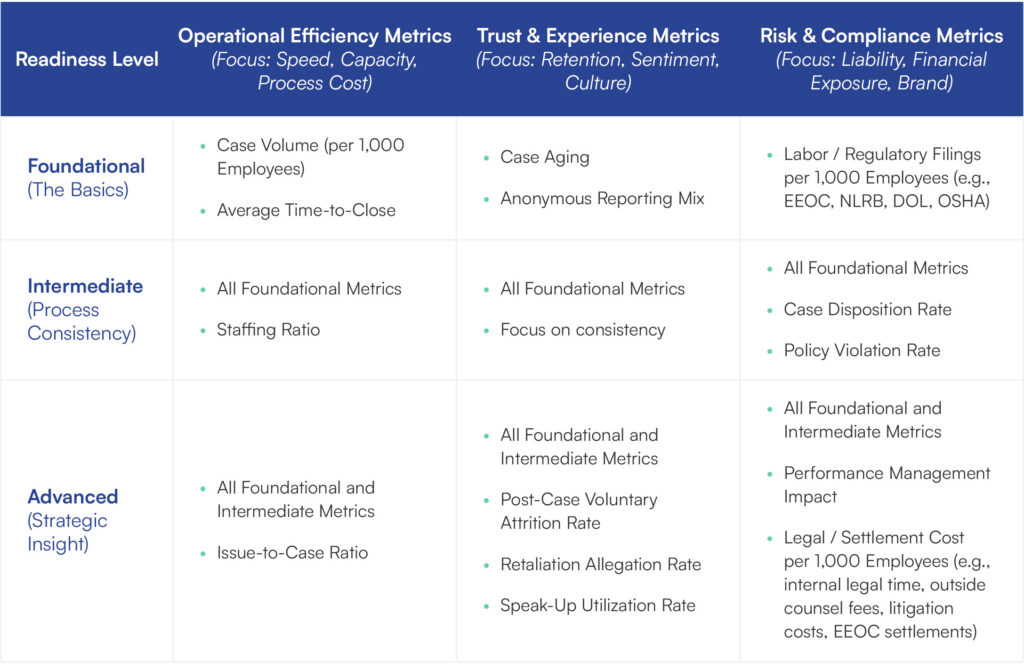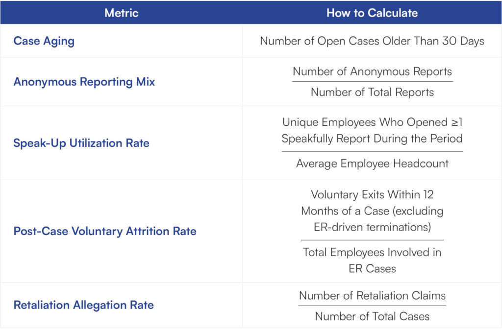 - Build it: Keep the metric but understand that you won’t be able to report on it for 90 days while you build a baseline. (For instance, to track Anonymous Reporting Mix, you must start tagging “Anonymous” vs “Named” on every intake starting today to have the data you need in three months’ time.)