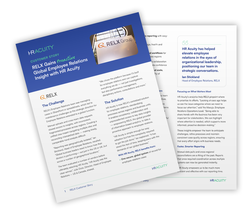 HR Acuity is now RELX’s centralized solution for employee relations, standardizing processes across regions and business units. It enables consistency, collaboration and unprecedented access to key data insights — empowering RELX, the global provider of information-based analytics, to take a proactive approach to employee relations.